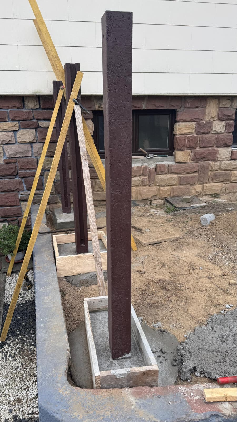 Une fois les poteaux en place, ils sont maintenus par un système d’étais. Cet appui temporaire permet de conserver le bon alignement et de garantir la stabilité pendant toute la durée du séchage du béton.