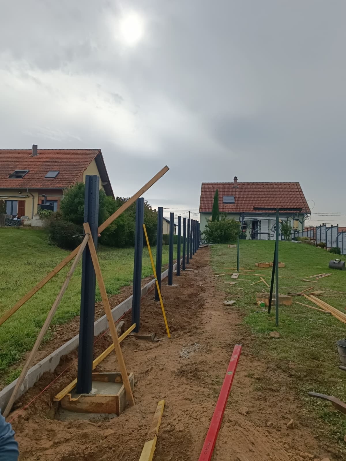 Les poteaux sont ensuite positionnés avec précision. Nous vérifions leur alignement et leur niveau afin d’obtenir une clôture parfaitement droite et régulière. Cette étape demande une attention particulière pour éviter tout défaut visuel à la fin des travaux.